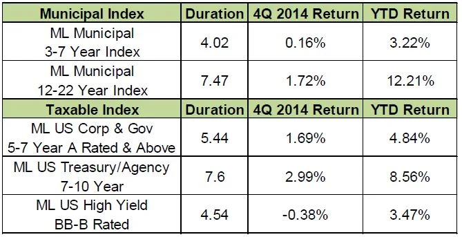Long municipal bonds had the best performance of 2014, while municipal bonds in the 3‐7 year range and high yield paper performed the worst.