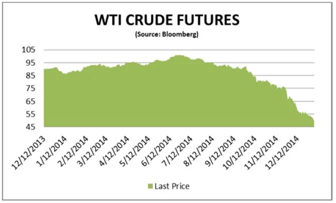 The U.S. economy has shown some recent signs of improvement, including a revised third quarter GDP growth rate of 5.0% (quarter over quarter), the highest in over ten years. While arguments can be made about the source and sustainability of this growth, we believe the sizeable declines in the price of oil over the past few months will further stimulate the economy. The U.S. consumer accounts for roughly 70% of economic growth, and lower gas prices mean more discretionary income to fuel that growth. The ultimate size of this impact will depend on how low oil prices get, and how long they stay there. The chart below shows the decline in the price of oil from over $100 per barrel in June 2014 to below $50 in the New Year.