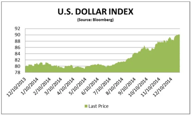 The dollar has appreciated over 14% percent since July of 2014. This increase can be attributed to a stronger U.S. economy, a flight from geo‐political risk, and higher U.S. interest rates (compared to global rates). While often the sign of a strengthening economy, this appreciation will also make our exports more expensive and hinder our ability to sell goods overseas. The potential for slower exports, coupled with negative demographic trends and high global debt levels should dampen the positive impact of lower oil prices domestically. The chart below shows the U.S. dollar index over the past year.