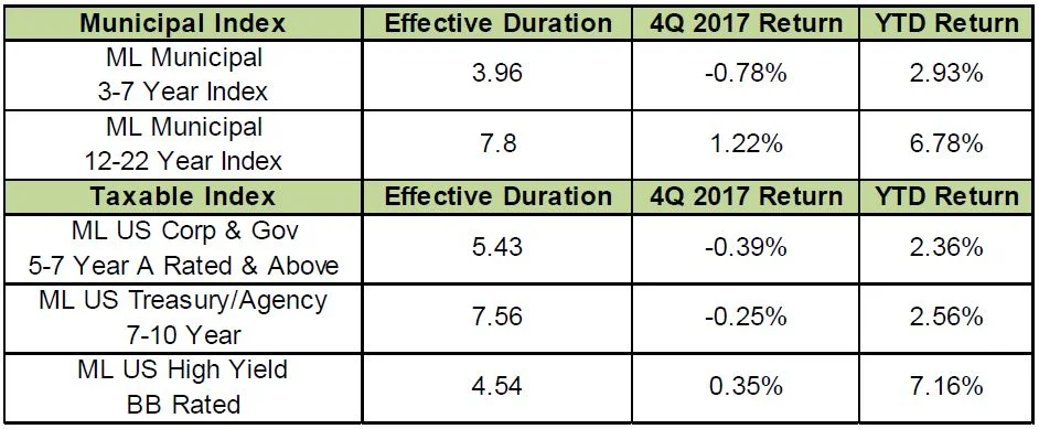 Duration performed well in 2017 as the yield curve flattened. Treasury yields rose from 1.21% to 1.88% on 2‐year notes while yields dropped on 30‐year treasury bonds from 3.04% to end the year at 2.74%. The high yield sector outperformed with equities, followed by long municipals, intermediate municipals, and intermediate government and agency paper.