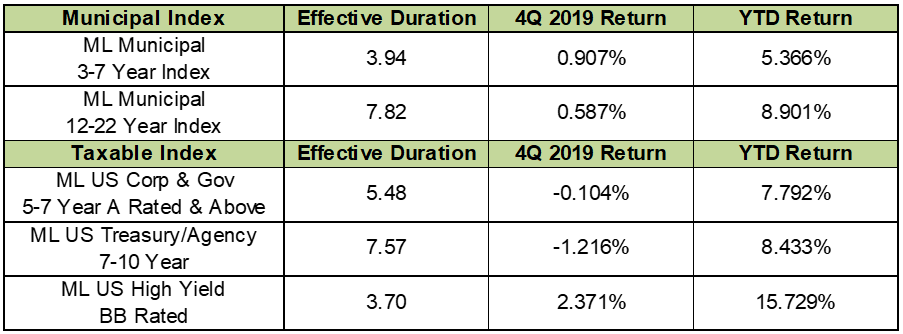 High yield bonds outperformed with equities to end the year up 15% (ML US High Yield BB Rated). While longer bonds were down slightly in Q4, they still posted strong gains for the year and outperformed shorter maturities by a wide margin. Treasuries, Agencies, Corporates, and Municipal bonds all performed well against a backdrop of falling rates.