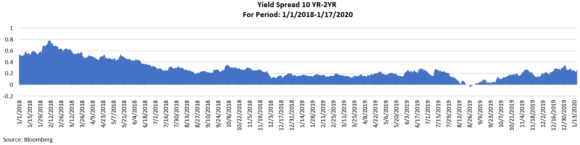 When the Fed was tightening in 2018 and early 2019 the bond markets began discounting a recession. This belief was based upon the popular narrative that a yield curve inversion was an accurate predictor of an upcoming recession in the next year. The chart below shows the spread between the 10 YR UST and the 2 YR UST. These maturities are our preferred gage of an inversion. The yield curve shows a modest inversion occurred. The NY Fed model which uses the spread between the 10 YR UST and the 90 Day T-Bill at one point was forecasting a 40% chance of a recession in a year. The Fed then began to lower short term rates and the probability of a recession occurring is now down to 23.6%. During this time we have still not had a recession. Investors should not rely on any single indicator as the ultimate fail proof sign of what is going to happen in the economy.