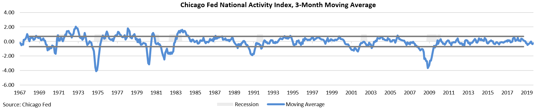 We also follow the Chicago Fed National Activity Index which is shown below. This index which consists of multiple indicators is not currently flashing a warning signal for the economy. It gives a warning signal when the 3-month moving average of the index falls below the bottom of the horizontal band.