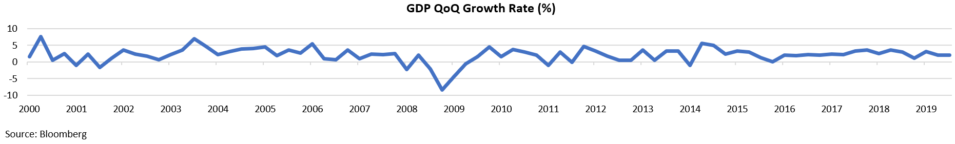 It is also important to examine the fundamental forces which are present in the economy. There are deflationary forces and possible inflationary forces which are currently battling each other in our global economy. The deflationary forces are over-indebtedness, negative demographics, and technological advances for most of the developed countries. Governments are extremely concerned about the possibility of deflation in an over-indebted world and appear to be willing to do “whatever it takes” to stop deflation. The U.S. is currently running $1 trillion a year deficits and is easing monetary policy in an effort to ensure we have economic growth. The Fed has not only lowered the Fed Funds rate, but they have also been engaging in Quantitative Easing (QE). They are being very pro-active with fiscal and monetary policy acting together to stimulate economic activity. This is occurring when the economy is still growing at about 2.0% annually. The chart below shows the quarter over quarter growth of GDP since 2000.