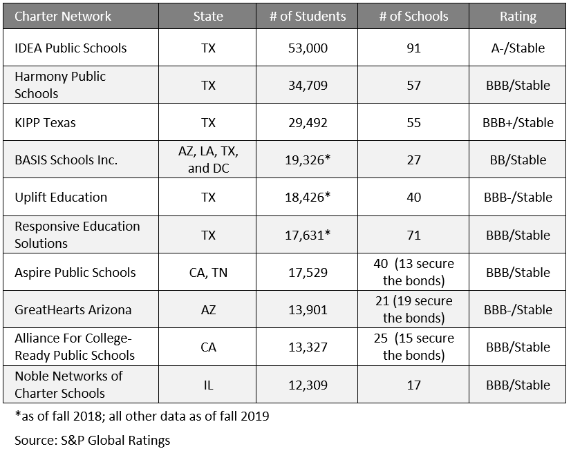 Standard & Poors recently released their 2020 outlook for Charter School bonds. We believe S&P rates bonds in this sector very conservatively. We find ratings are typically a notch or two lower than we think is appropriate. There are certain key metrics which we like to see in these types of securities. First, the system should have an operating history for a network of existing schools. After the first Charter School is opened, if it is successful, there will be demand for more students to attend the school and a waiting list is created. When the list gets large enough a new school will be opened. As the Charter system grows the record of academic performance becomes more meaningful, and a financial history is created. We like to see the original charter being in existence for at least 8 years. Second, it is important for the school to demonstrate academic success. Schools with a strong record of academic achievement are much less likely to have a problem getting their charters renewed. Third, academic success creates demand for the school. One measure of demand is the size of the wait list to be admitted to the school. The best schools have wait lists that are large compared to the number of students attending the school. Fourth, we look for strong management and governance with a proven track record. The Charter schools that have already opened several schools on time and without cost overruns while meeting budget estimates are the most desirable. Finally, it is important for the investor to have a strong security interest in the property with a first lien on the facility and the network should have a strong historical record of economic soundness. The table below shows 9 of the largest Charter School Networks in the U.S.
